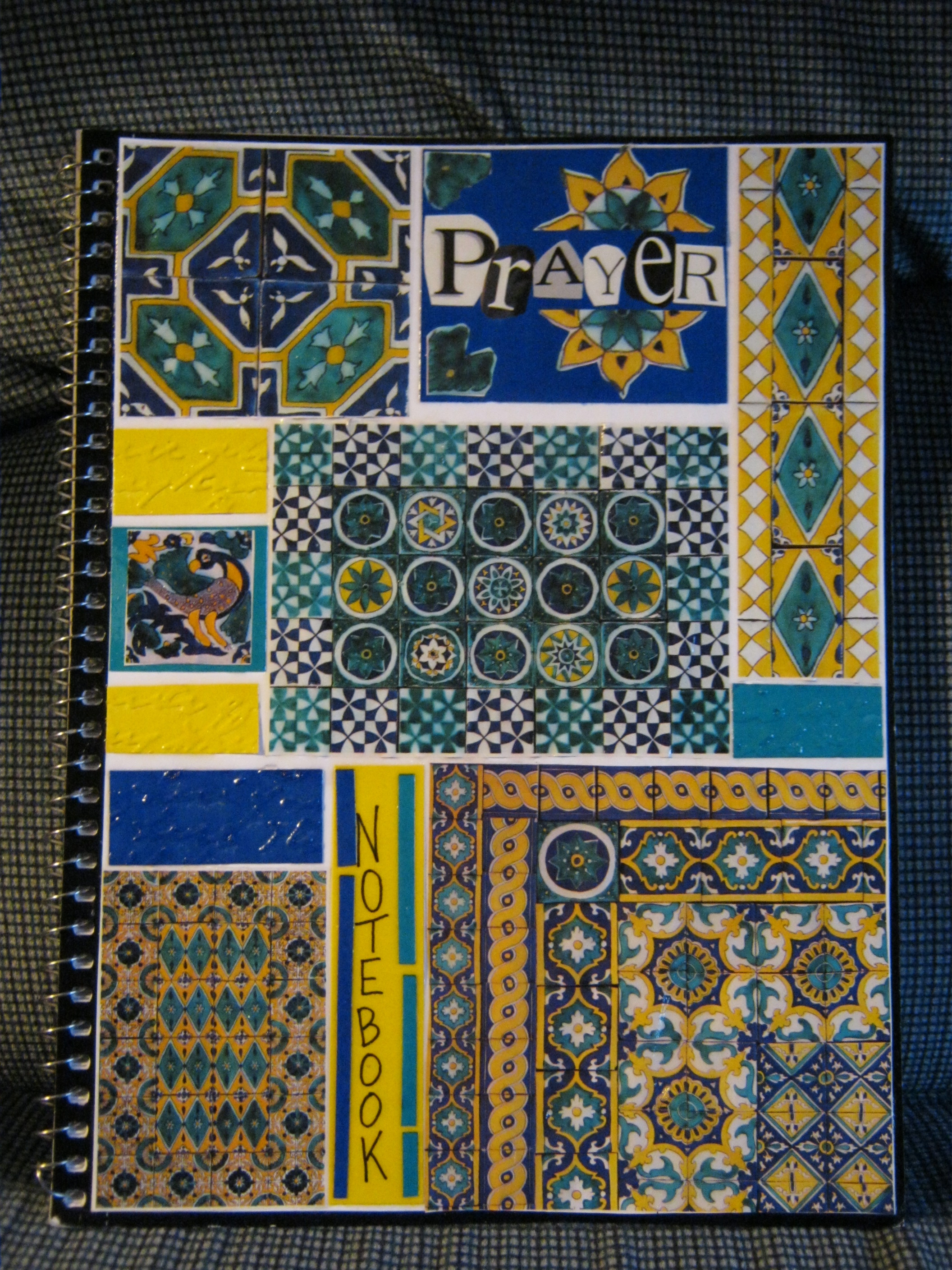 That notebook is now full, and I’m moving on to a more artsy notebook for 2011. My first idea was to use the images of the praying women from an art postcard I had–the artist is Melinda Moore Lampkin. As I was looking through magazines, I found an article in Traditional Home Magazine (where did that come from?) about Moroccan tiles. I love hand-painted tiles, and so the second notebook emerged.