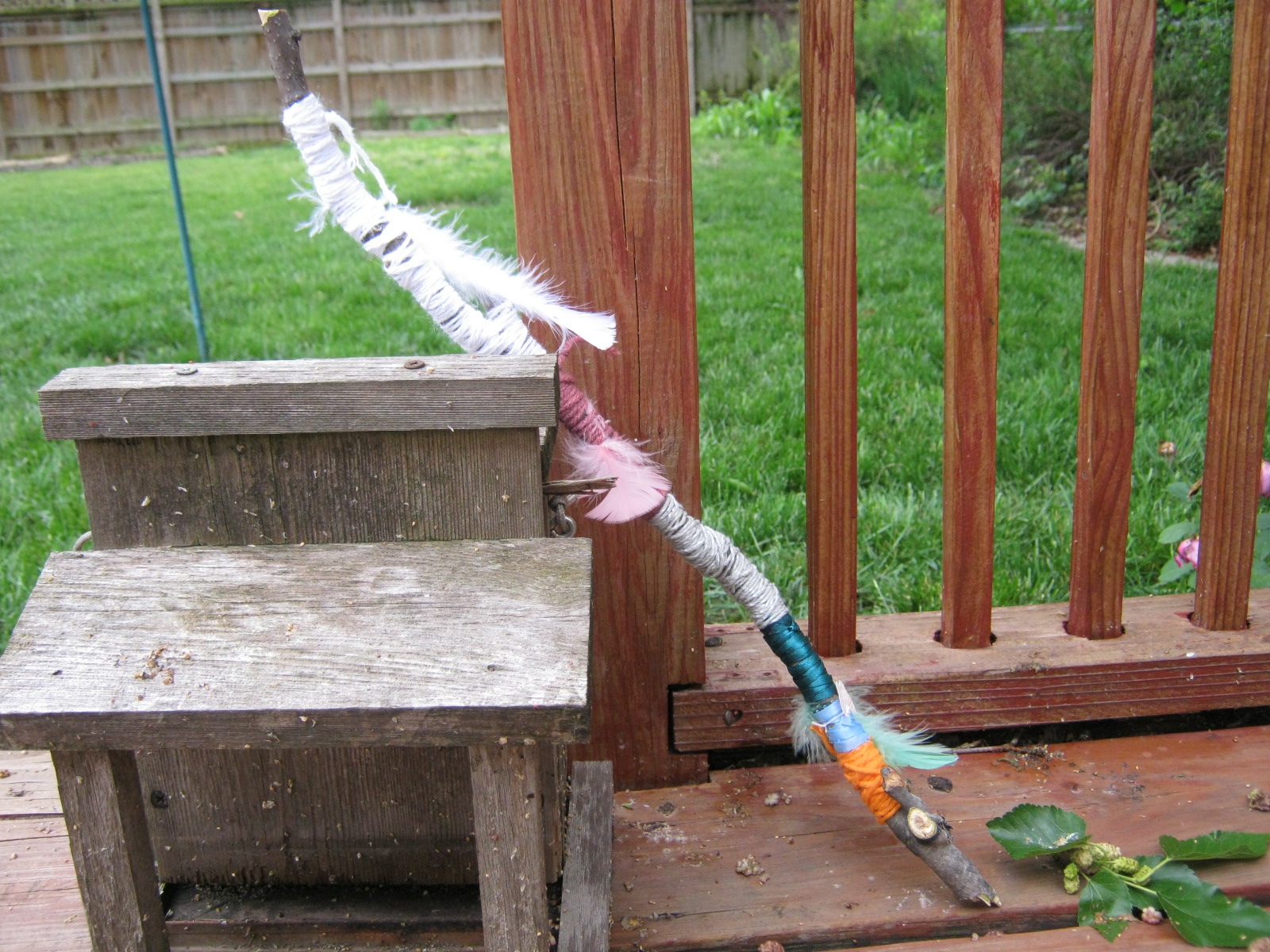 Once you have your stick, you will also need a few different colors of yarn or ribbon. Feathers, beads, and pendants are optional.