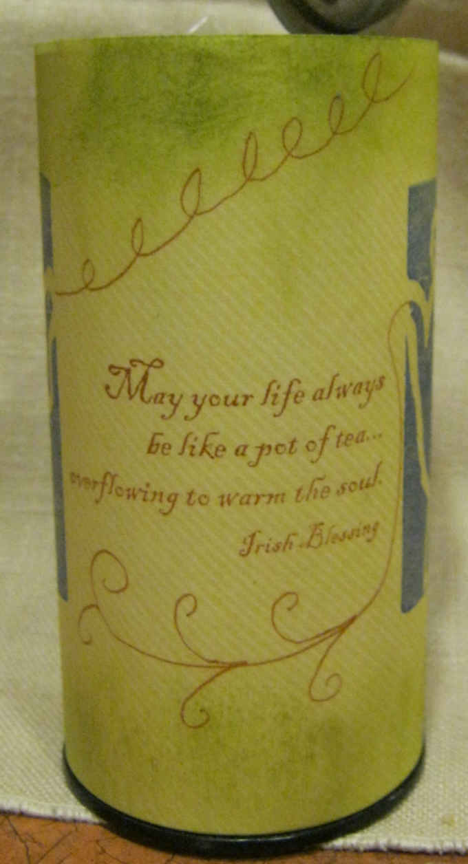 O.K. “Tea Holder” is a funky name for what I made. My brain is barely working. Tonight I decorated an empty tea bag canister to use to hold loose leaf tea and my infuser. I used some tea pot stamps that I carved quite a while ago. (I’m not terribly happy with how this turned out and I might re-cover it for a later project–but at least I created something today!)
