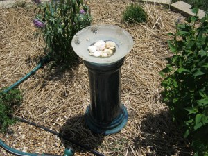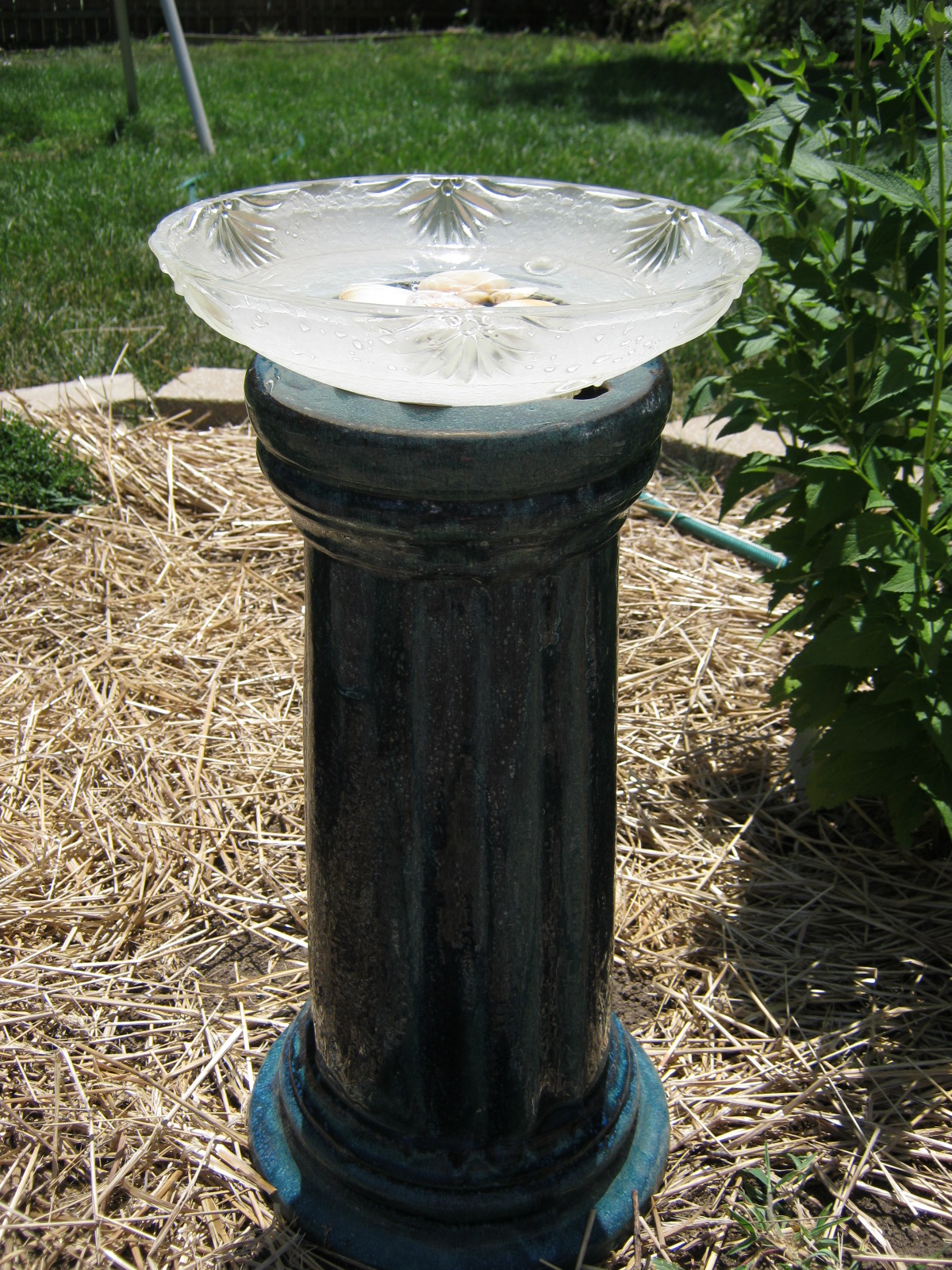 Today is another joint project with Grace. Last winter the top part of our bird bath cracked, so today we went to the Habitat Restore and found a lovely light fixture that would fit in the bird bath base. We filled in the indentation with shells, but the fixture on the base, and filled it with water. Now to wait and see if the birds will come!