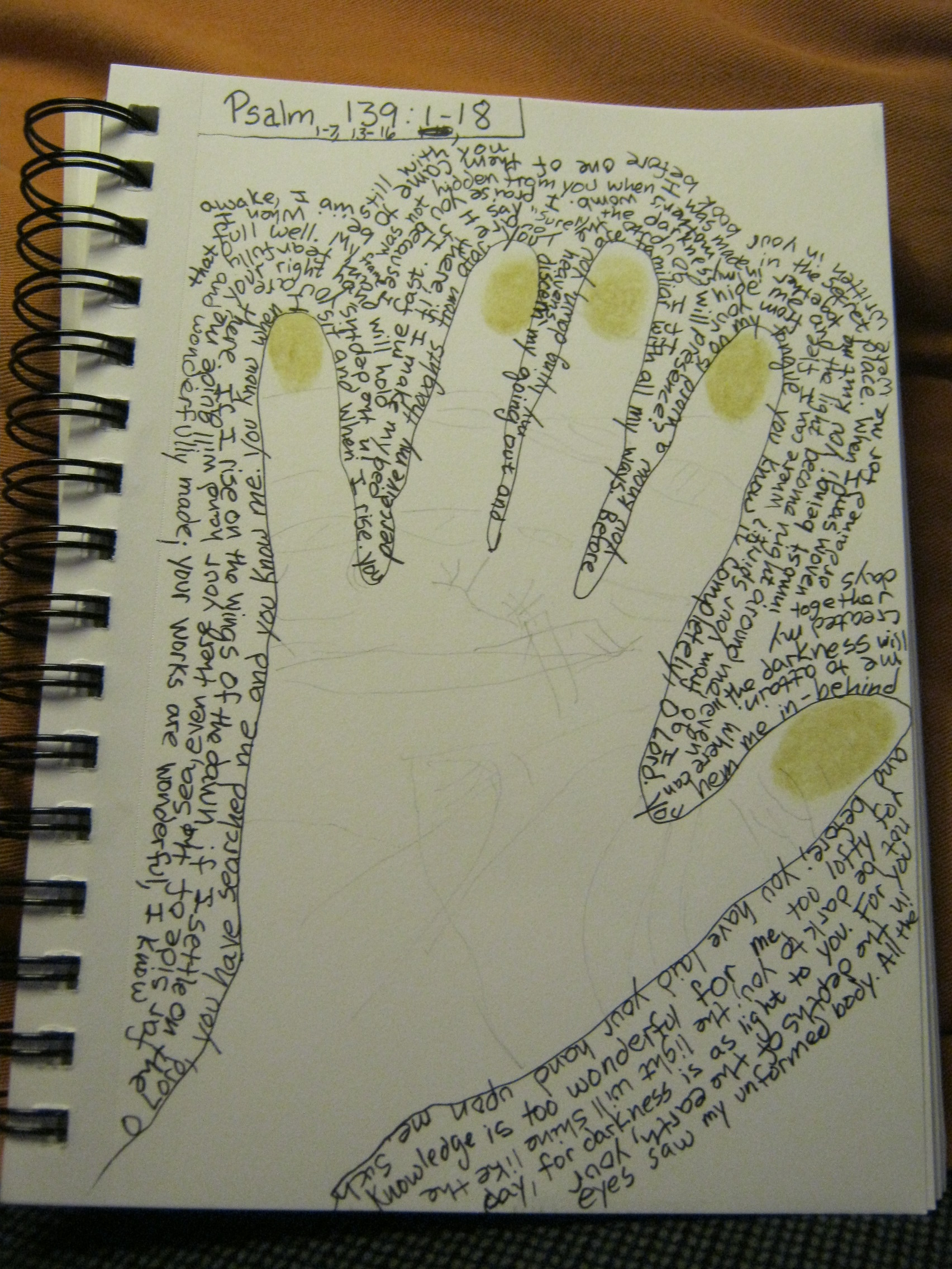 - Now begin writing out Psalm 139, writing the words around the outside of your hand drawing–up the side of the hand, then around each finger and down the other side. When your text has gone all the way around the hand drawing, simply make a second row of text.