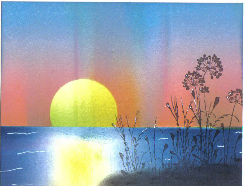 I attended a brayer workshop with Michelle Zindorf last Saturday, and it was wonderful! I’ve long been a fan of her website and I’ve made my own poor imitations of many of her cards. At the workshop, she encouraged us to develop our own projects. Notice the landscapes. Pay attention to sunsets.