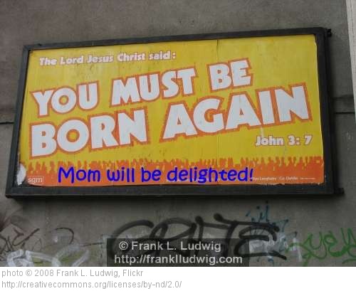 To begin with, we should clear up this whole “born again” issue anyway. The Greek term used can mean “born again” or “born from above.” From the context in John, it seems pretty clear that Nicodemus takes it to mean “born again”–“surely a man cannot enter a second time into his mother’s womb.” Jesus appears to mean “born from above”–not re-entering your mother’s womb, but being born of water and the Spirit. So if someone approaches you in the waiting room and asks if you’ve been “born from above,” at least you’ll know they’ve studied the Greek.